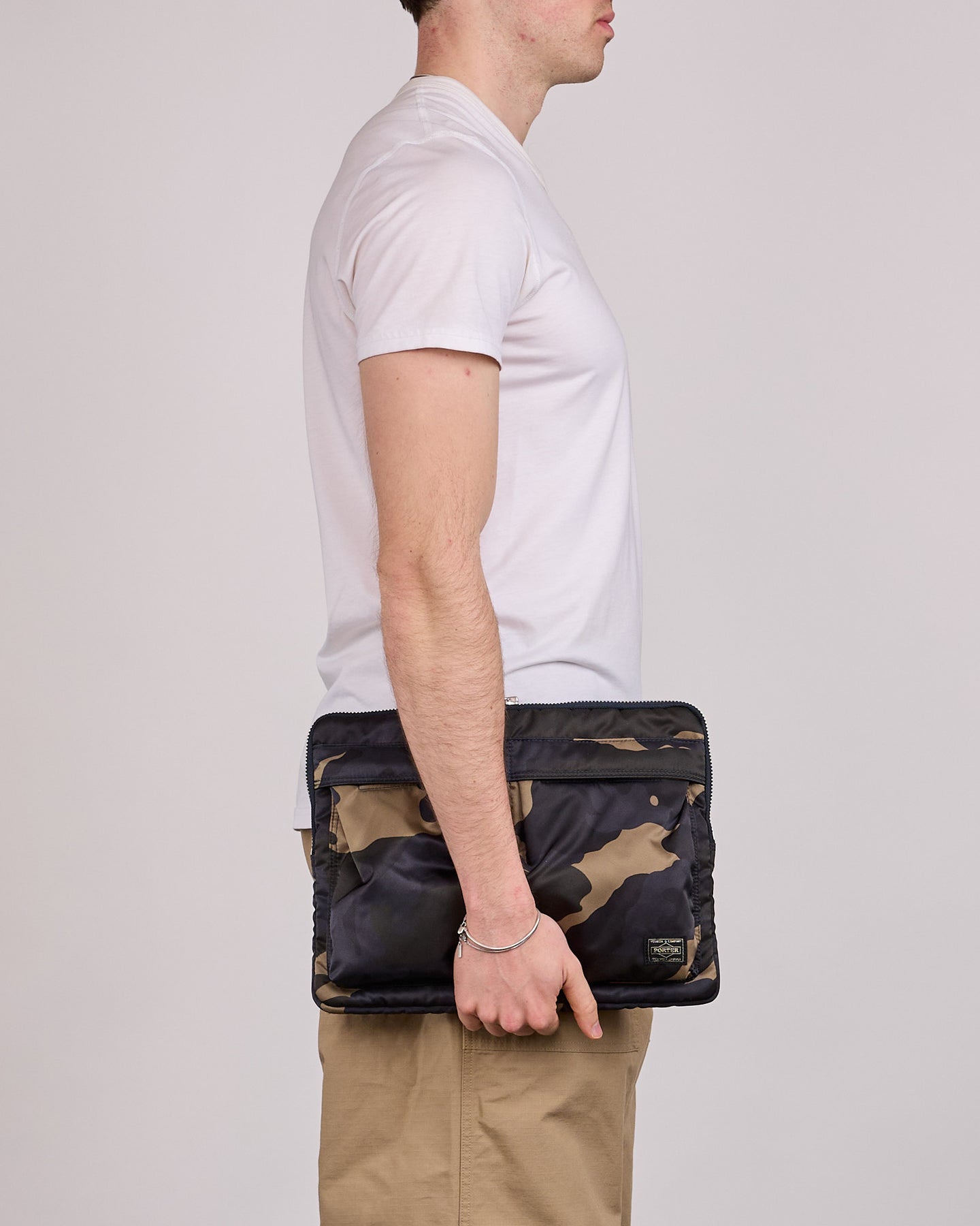 The Porter Counter Shade Document Case Woodland Khaki Camo is part of PORTER’s flagship-exclusive “Counter Shade” series, rendered in an original take on classic woodland camouflage. Built around the concept of counter shading, a camouflage method that balances light and shadow to blend into surroundings, the pattern is expressed through subdued tonal shifts for everyday versatility.