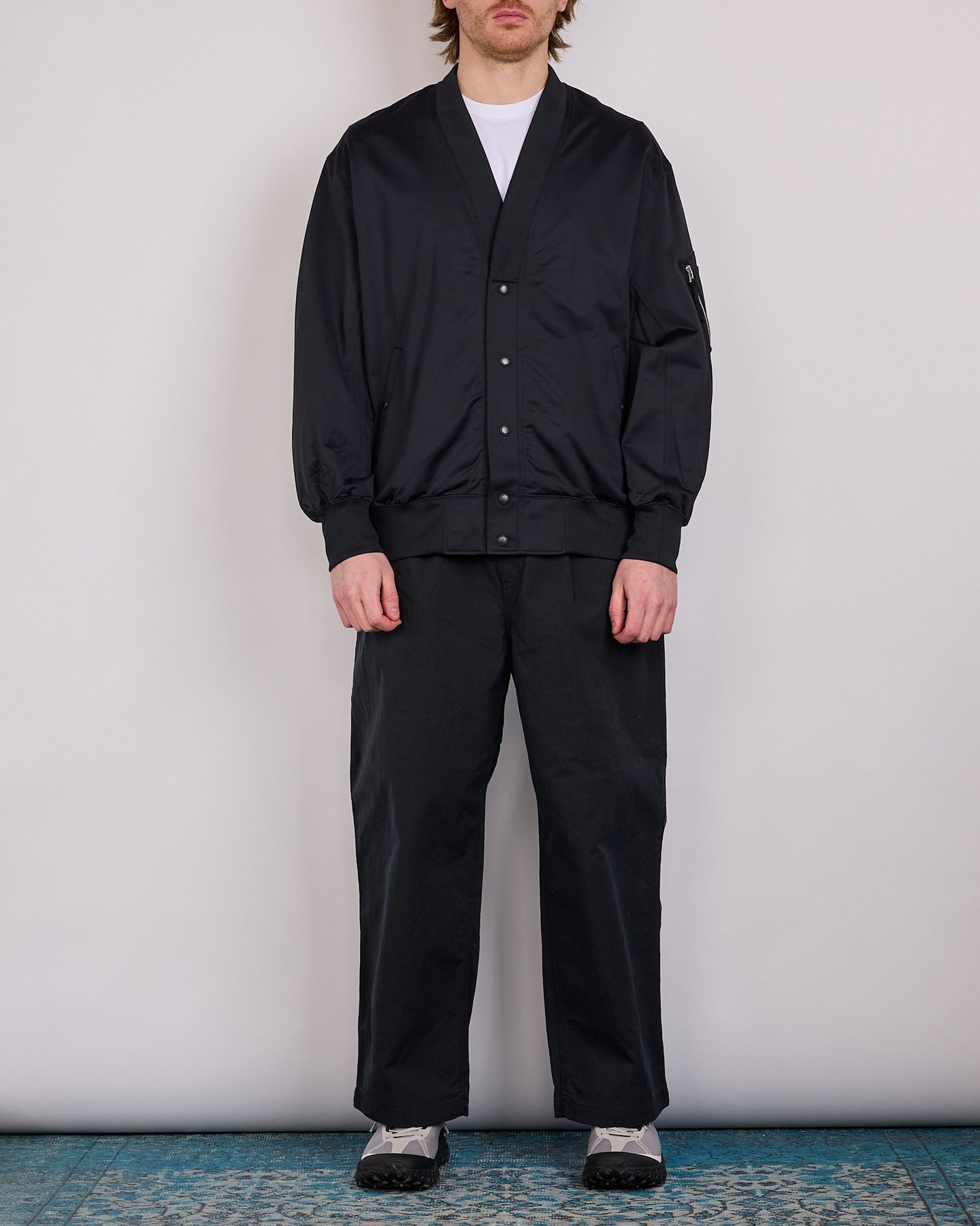 A bomber-inspired silhouette is defined by ribbed hems and cuffs, front snap fastening, and practical storage including two welt pockets and a sleeve utility pocket.