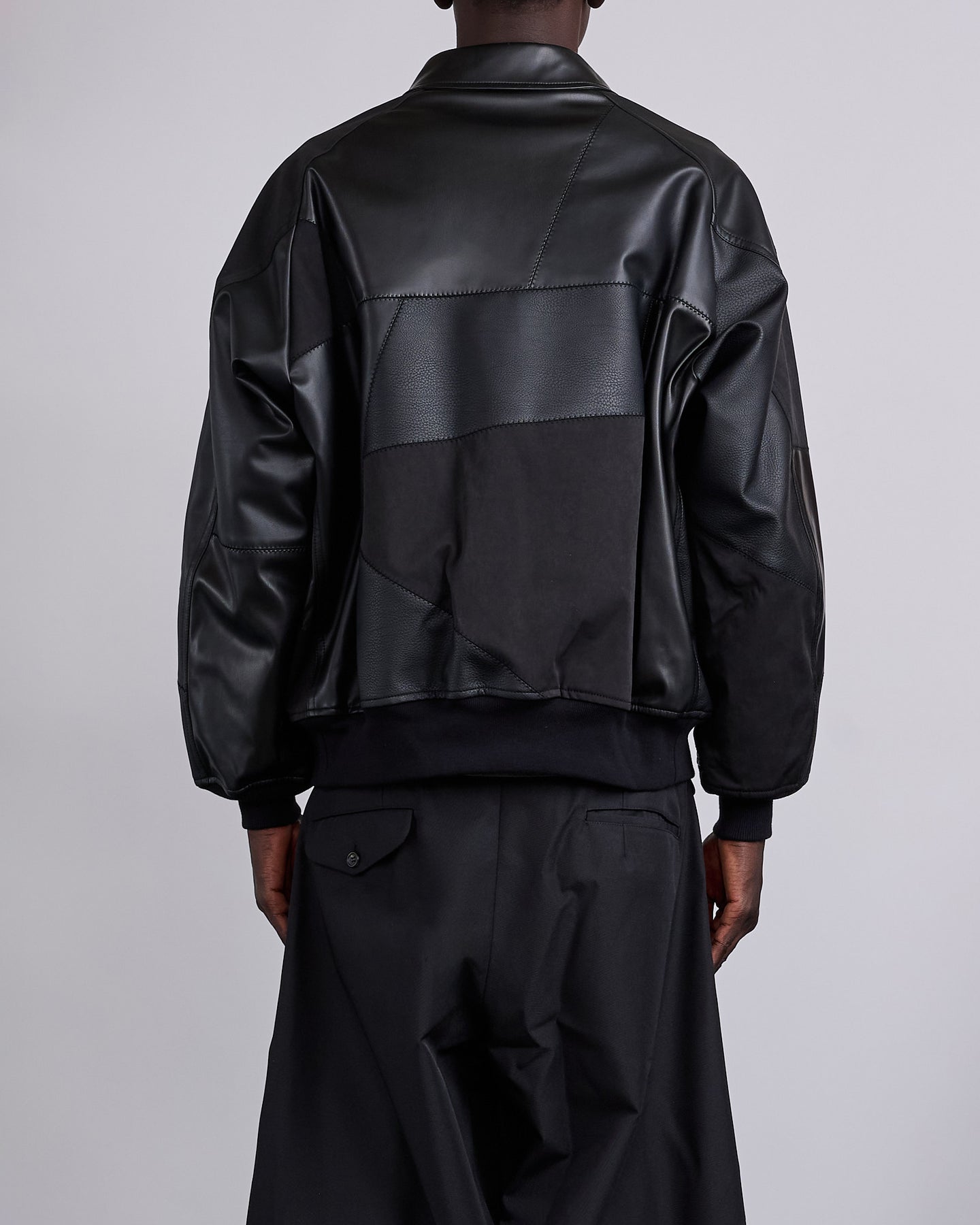 COMME des GARÇONS HOMME Synthetic Leather Jacket in Black Mix. A modern interpretation of the classic flight jacket, built with a patchwork construction that contrasts textures for a layered look. Designed with a structured point collar, flap pockets, and a concealed placket for a clean finish, while rib knit hem and cuffs anchor the silhouette. Made in Japan by CDG with signature precision.