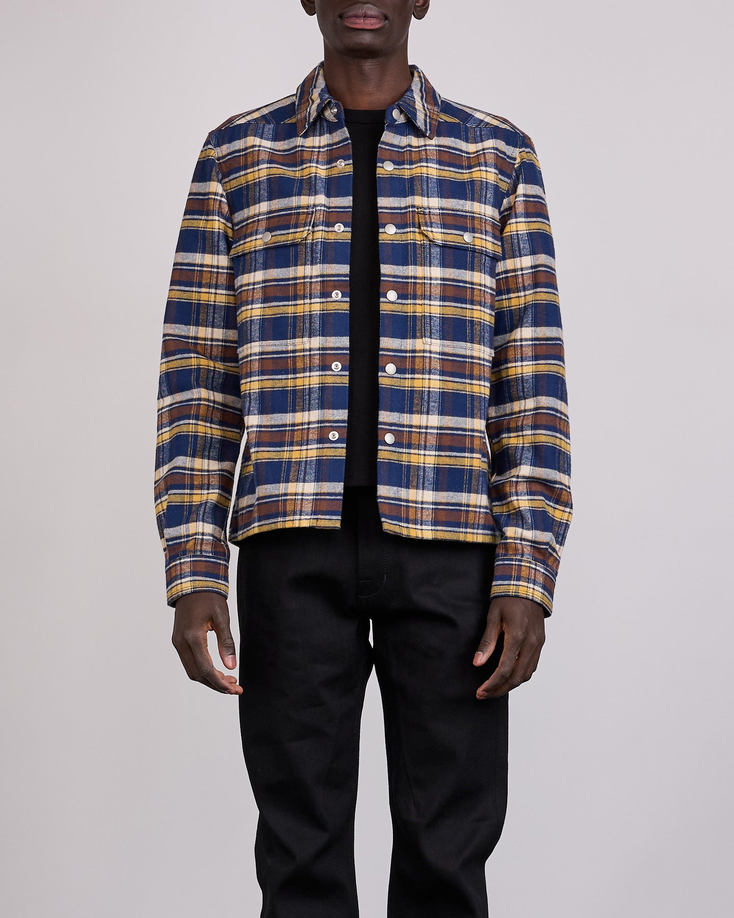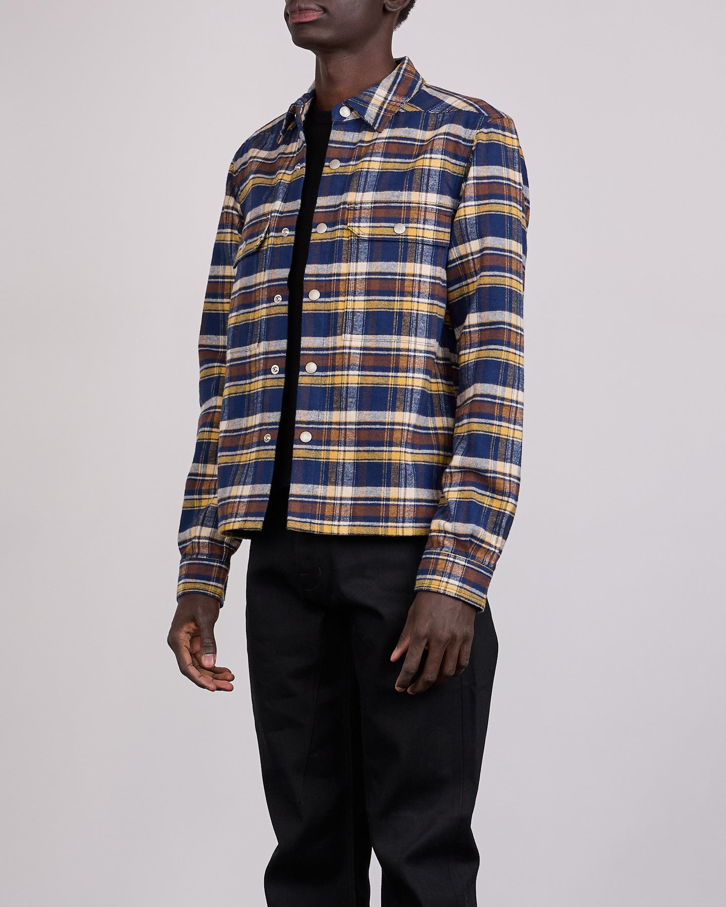 This cropped outers shirt is above hip length with a straight, boxy fit and long sleeves. It has a centre front opening with visible YKK snaps (made in Japan), a collar, a hem with beveled side seams and chainstitch thread run-off, and snap cuffs. It features two square pockets on the chest with flaps and beveled corners, signature level shoulder seams and double stitched seams.