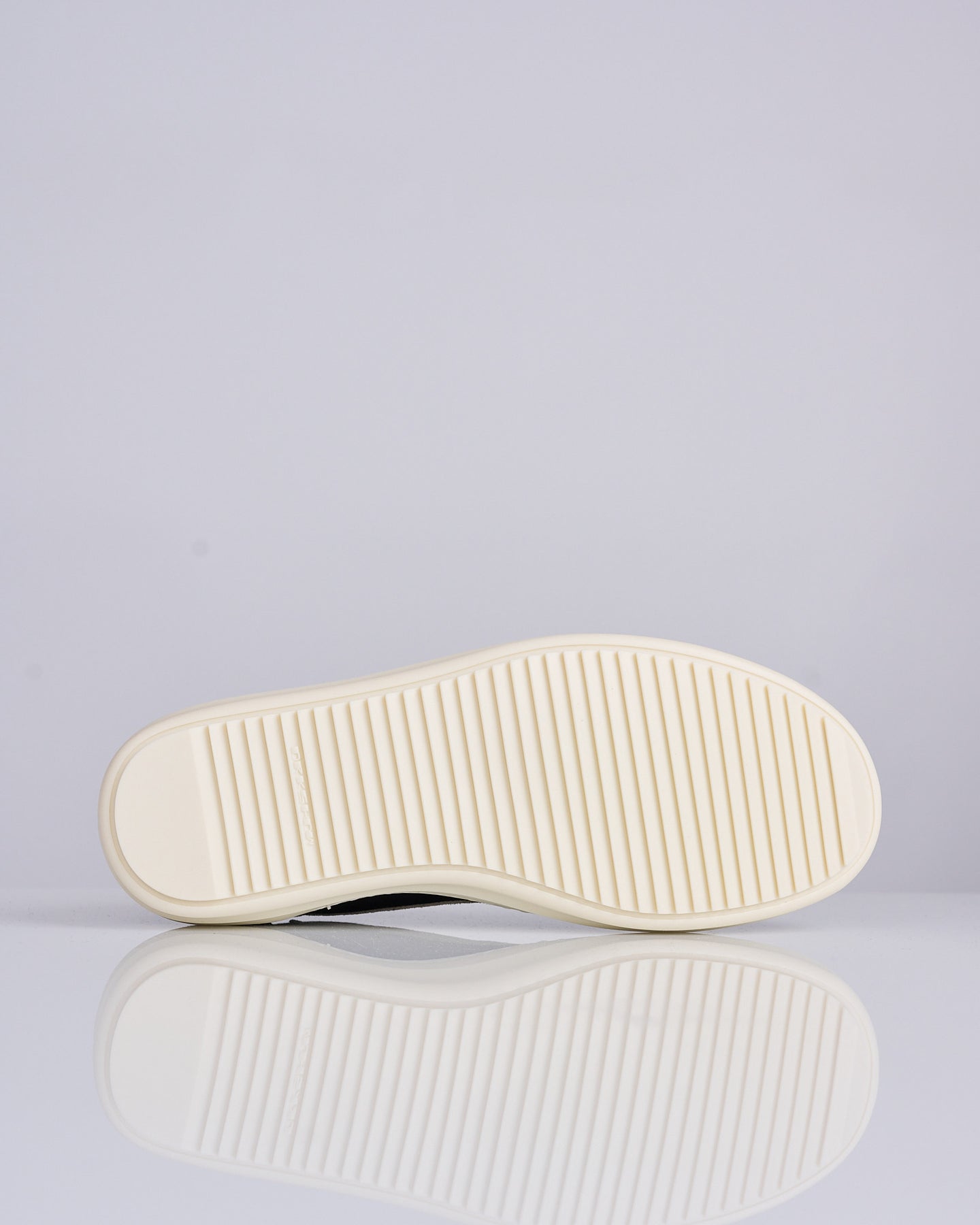 DRKSHDW FW25 concordians vintage sneaks in black/milk/milk 13oz overdyed denim and velour suede.