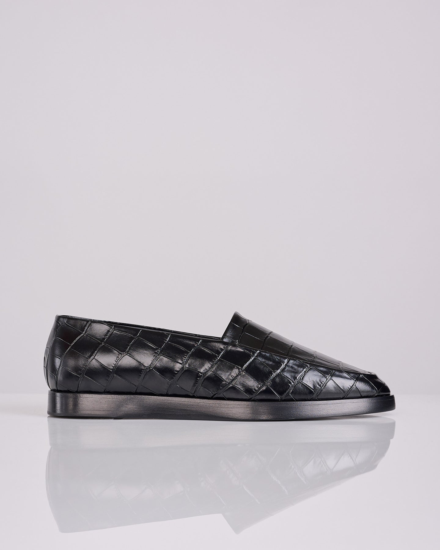 The Loafer is crafted in Italy from an croc embossed leather with a handmade leather sole. The traditional slip-on Loafer is evident in the moccasin stitch, but updated in a contemporary streamlined silhouette.