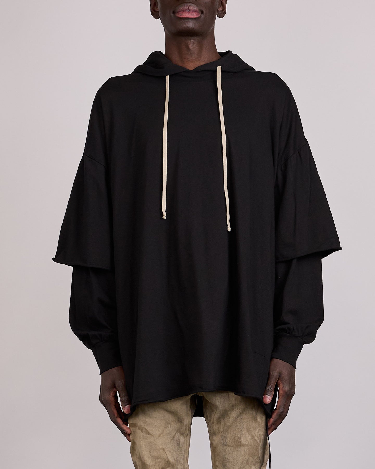 This Tommy Hustler hoodie is below-hip length with a jumbo oversized fit. It features a long sleeve T-shirt with ribbed cuffs and a drawstring hood, overlaid with a cropped oversize T-shirt with elbow length sleeves. It has the signature level shoulder seams and single seam running down the centre back spine. This mediumweight cotton jersey has a compact and dry handfeel. This jersey is garment dyed.