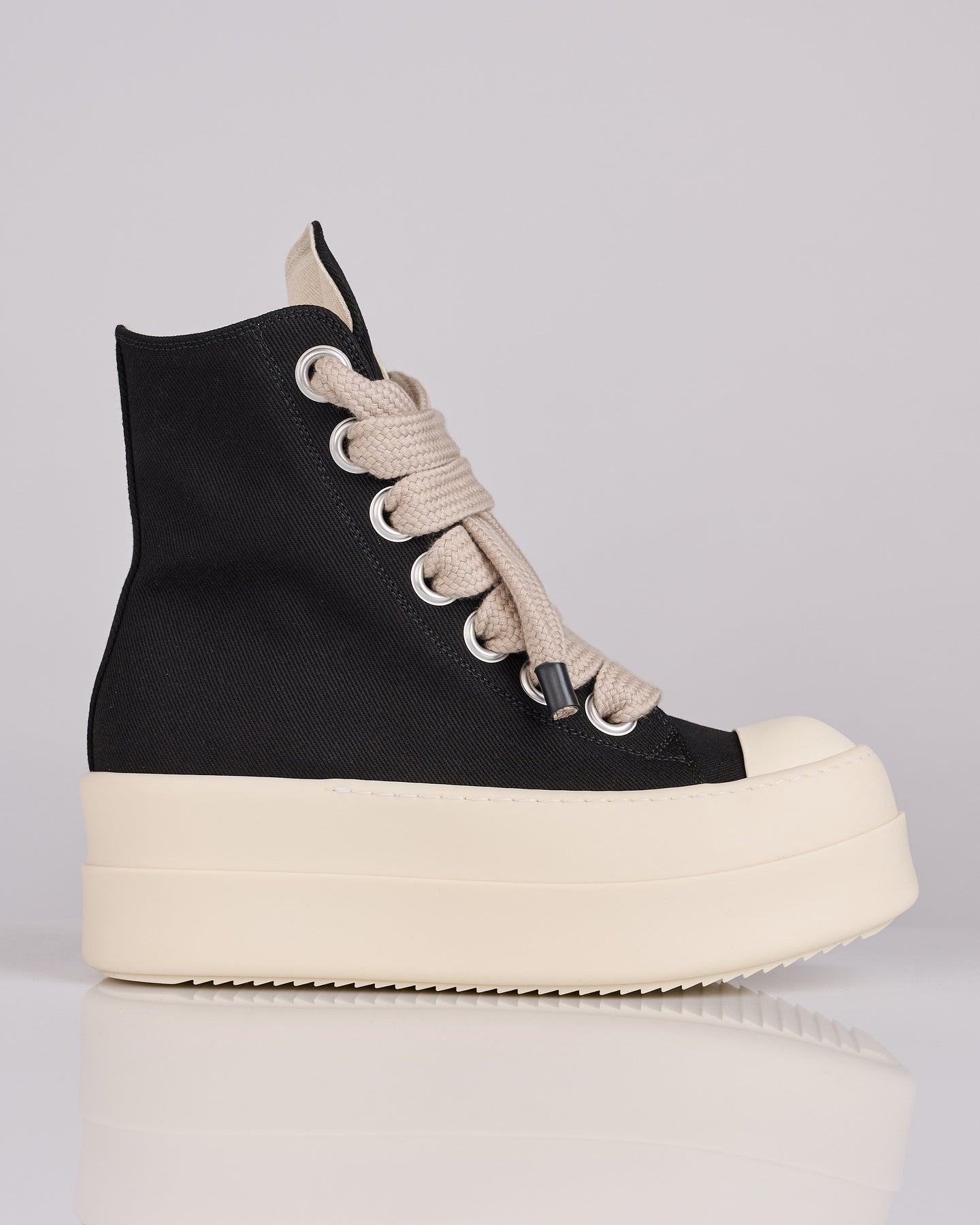 DRKSHDW SS26 Temple Mega Bumper Jumbolace Sneaks in Black/Milk/Milk 13oz Overdyed Denim