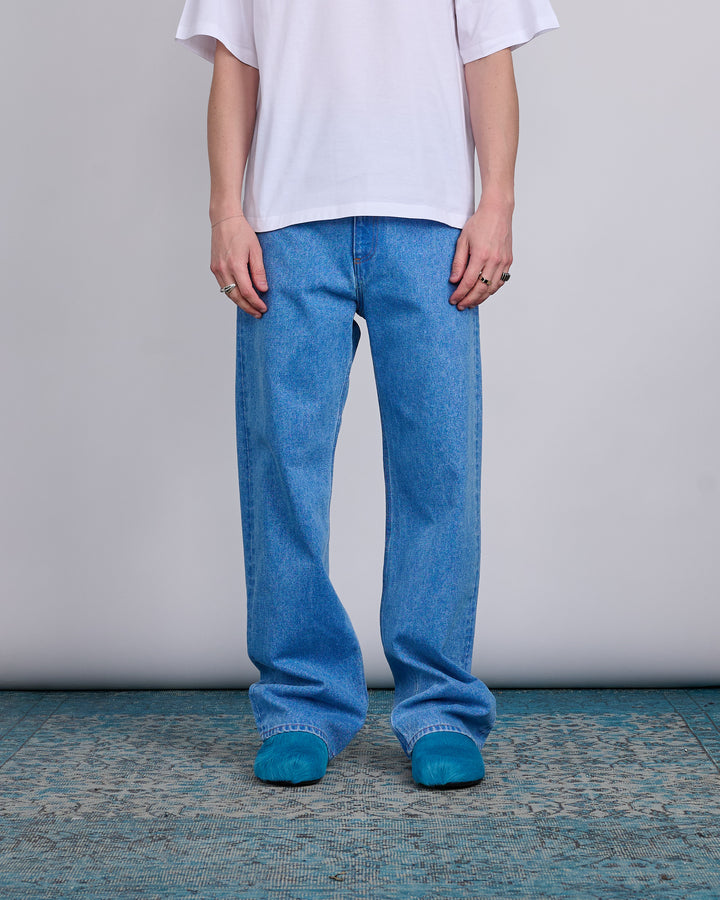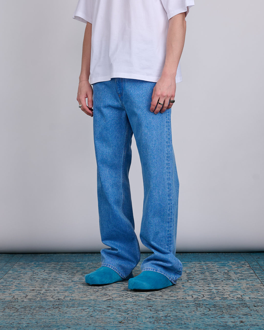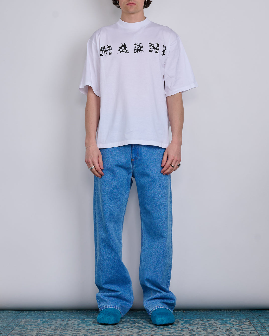 5-pocket jeans made from coated and stonewashed organic cotton denim. Relaxed mid-rise fit with relaxed leg leg. Button and zip fly. Leather patch with red Marni print on the back waist.