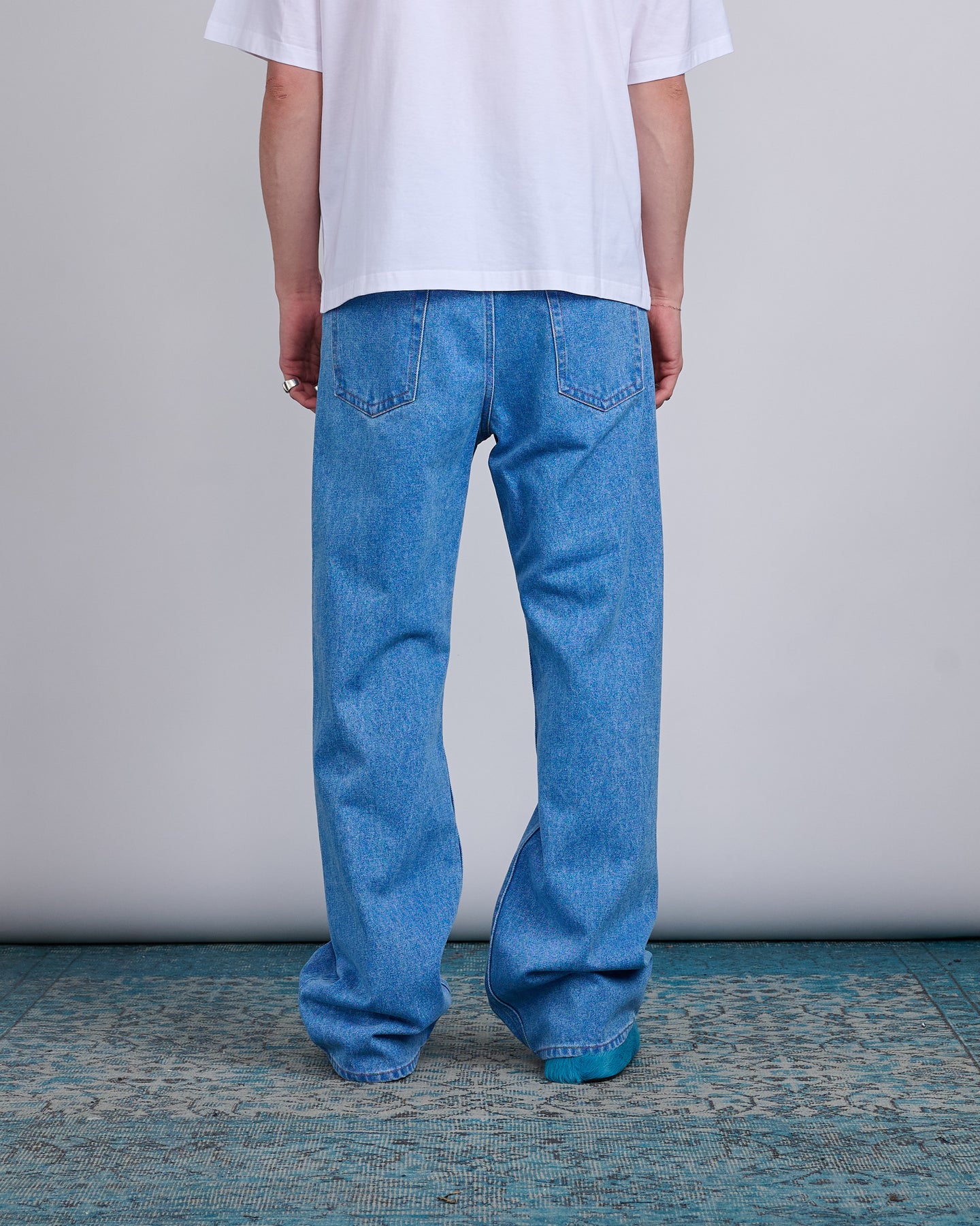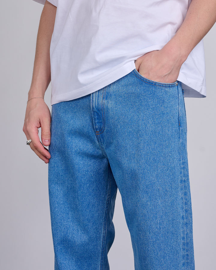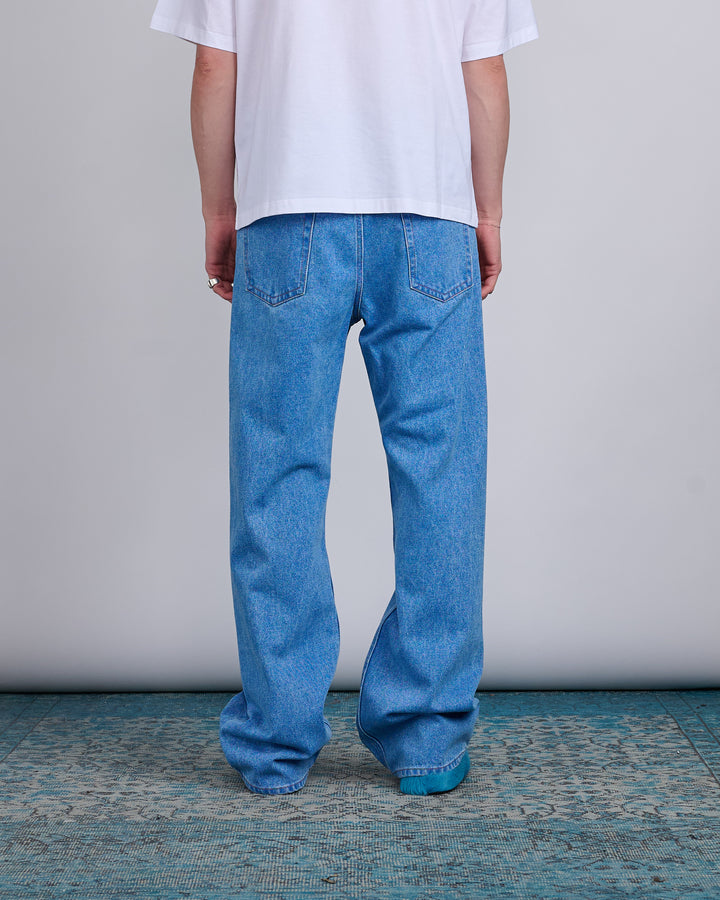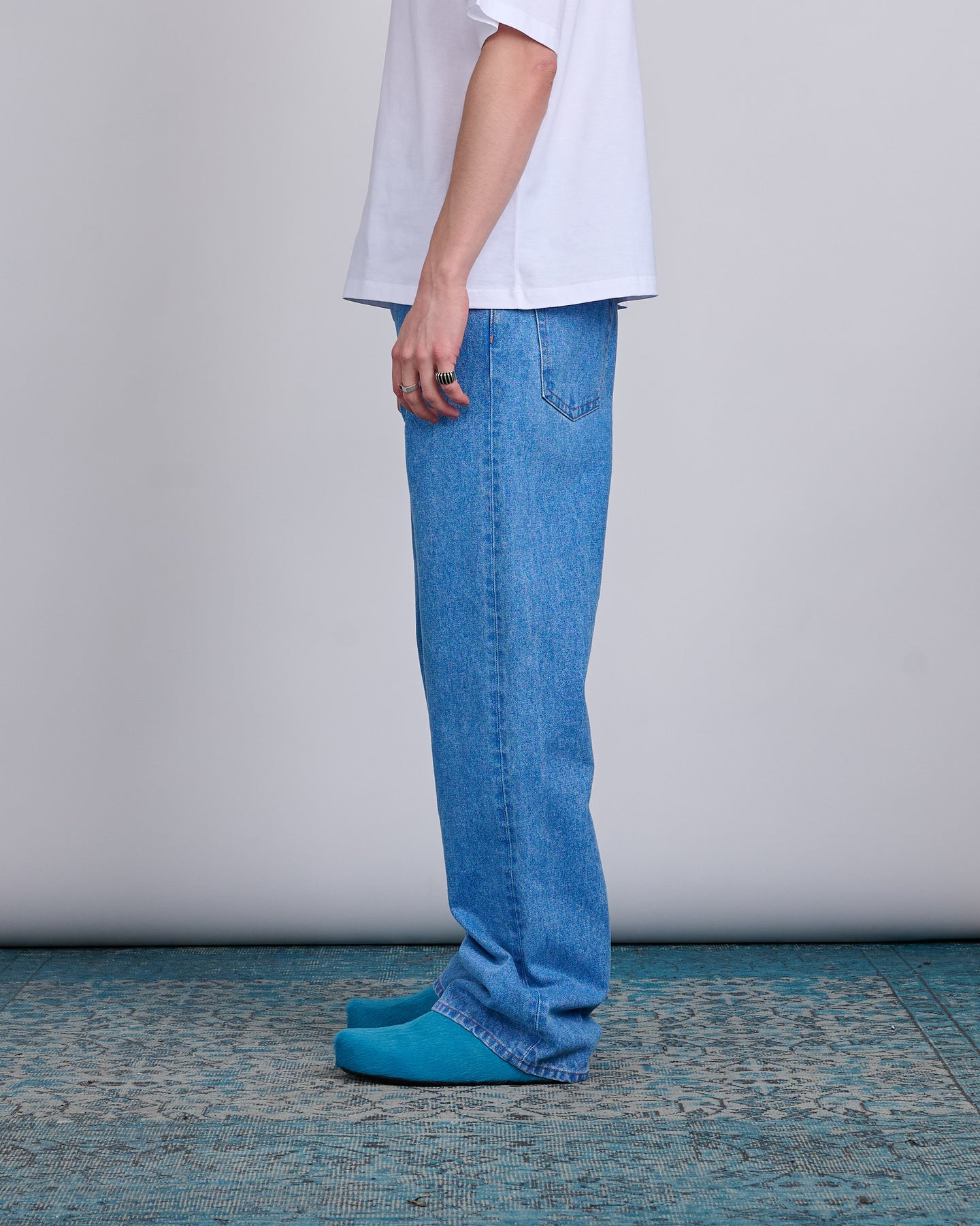 5-pocket jeans made from coated and stonewashed organic cotton denim. Relaxed mid-rise fit with relaxed leg leg. Button and zip fly. Leather patch with red Marni print on the back waist.