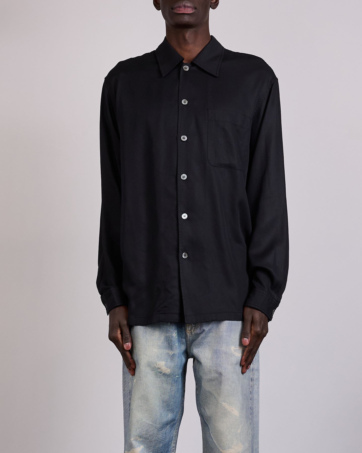 Produced in fluid Portuguese lyocell, the Our Legacy Every Button Shirt Draping Black Lyocell is defined by ease, movement, and quiet structure. The draping fabric lends a soft, weighted feel that flows naturally on the body, while subtle construction details add volume without excess. Cut with a relaxed fit and straight hem, it is finished with a clean placket and refined touches that elevate a minimal silhouette.