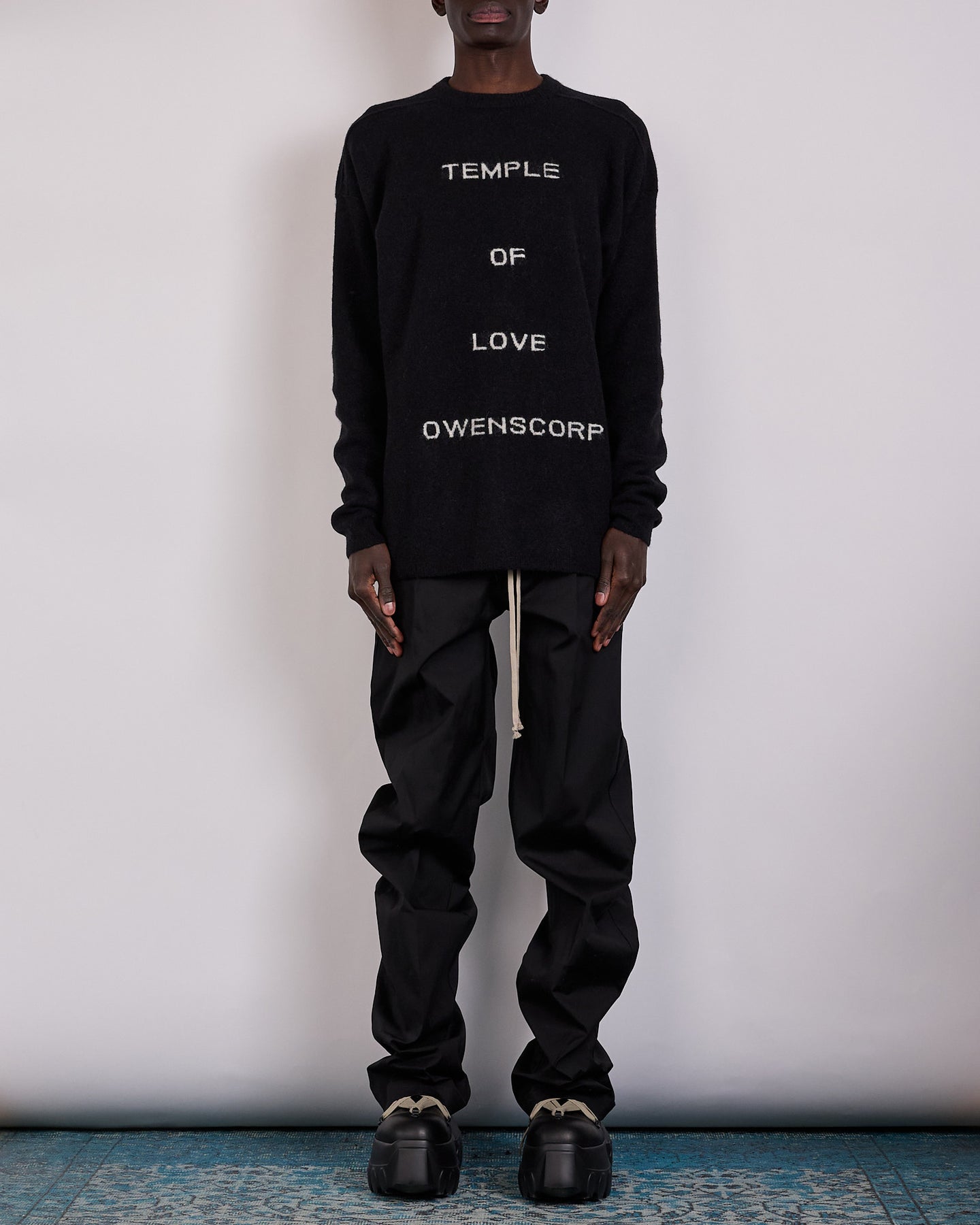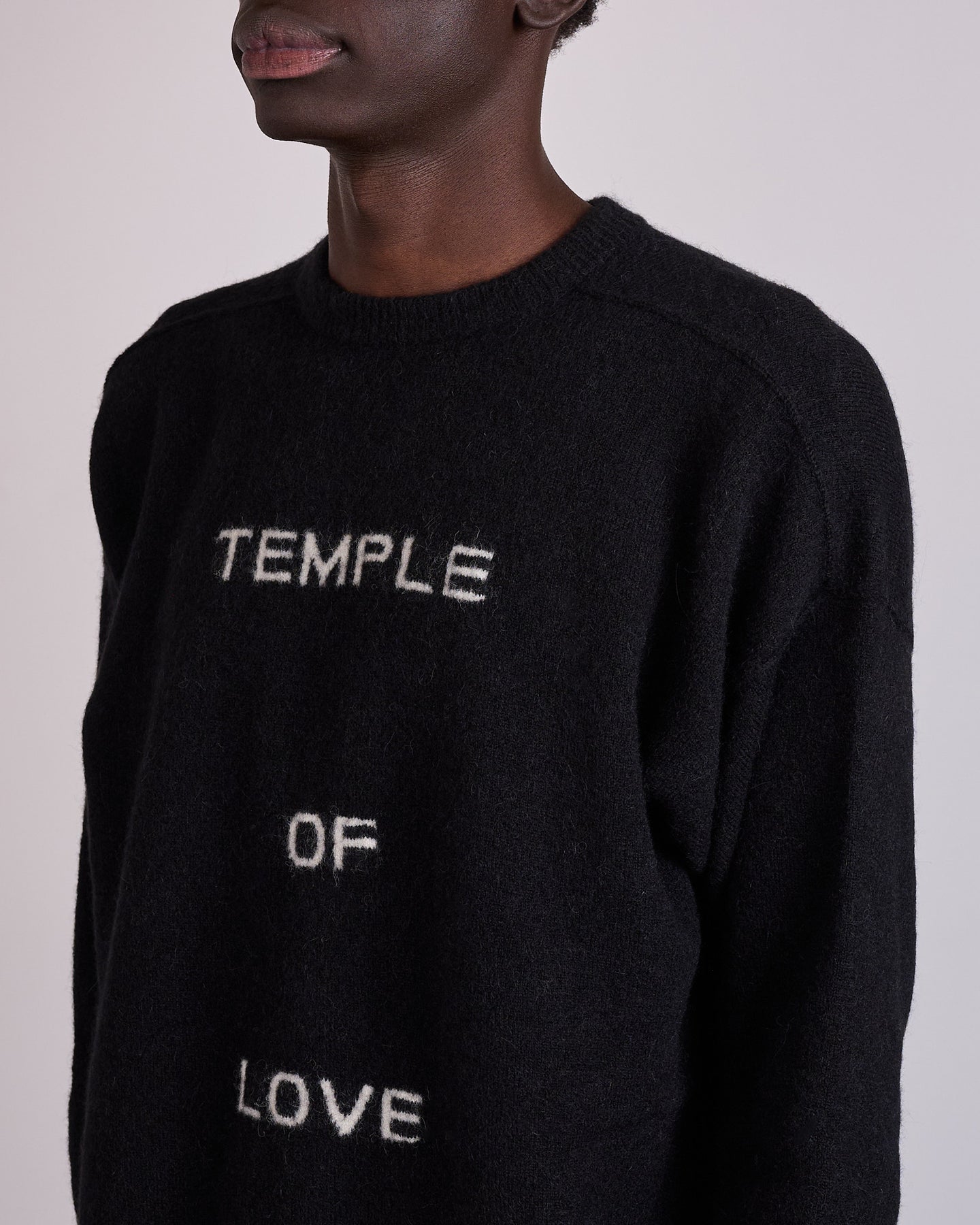 This round neck sweater is hip length with long sleeves and an ample fit. It has a ribbed round neck, cuffs and hem with small side splits. It features the signature front level shoulder line and a knit channel running down the centre back spine. This version features the “Temple of Love Owenscorp” motivo.