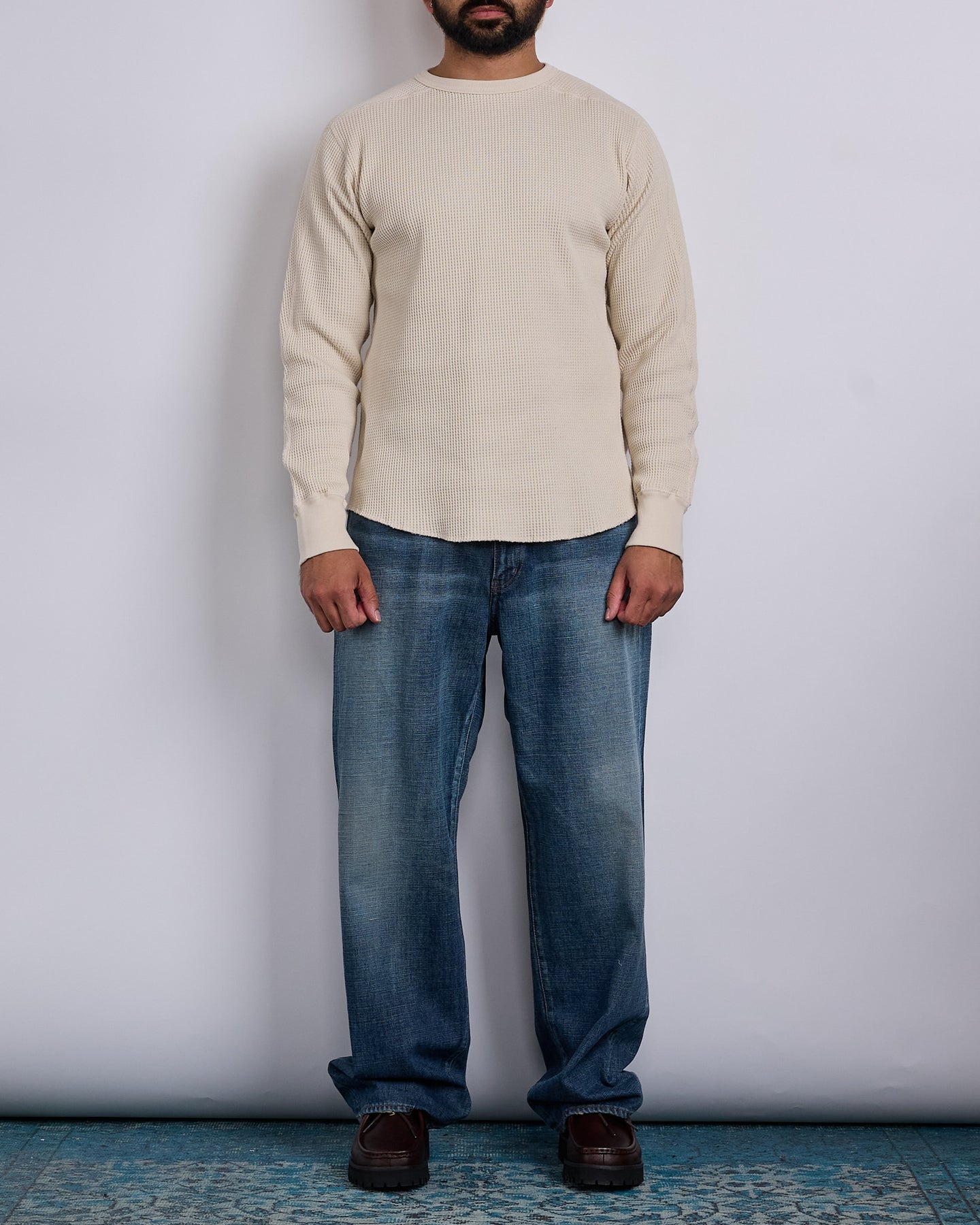 The nanamica Crewneck Thermal Sweatshirt is a modern take on the classic military undershirt, designed for warmth, comfort, and durability. Crafted from thermal fabric knitted with a covering core yarn, it blends organic cotton and recycled polyester for a soft, breathable feel with added structure. Featuring a moderate thickness and voluminous texture, it provides insulation without bulk. Flat seams enhance comfort by reducing unevenness, while the regular fit ensures a versatile, everyday wear silhouette.