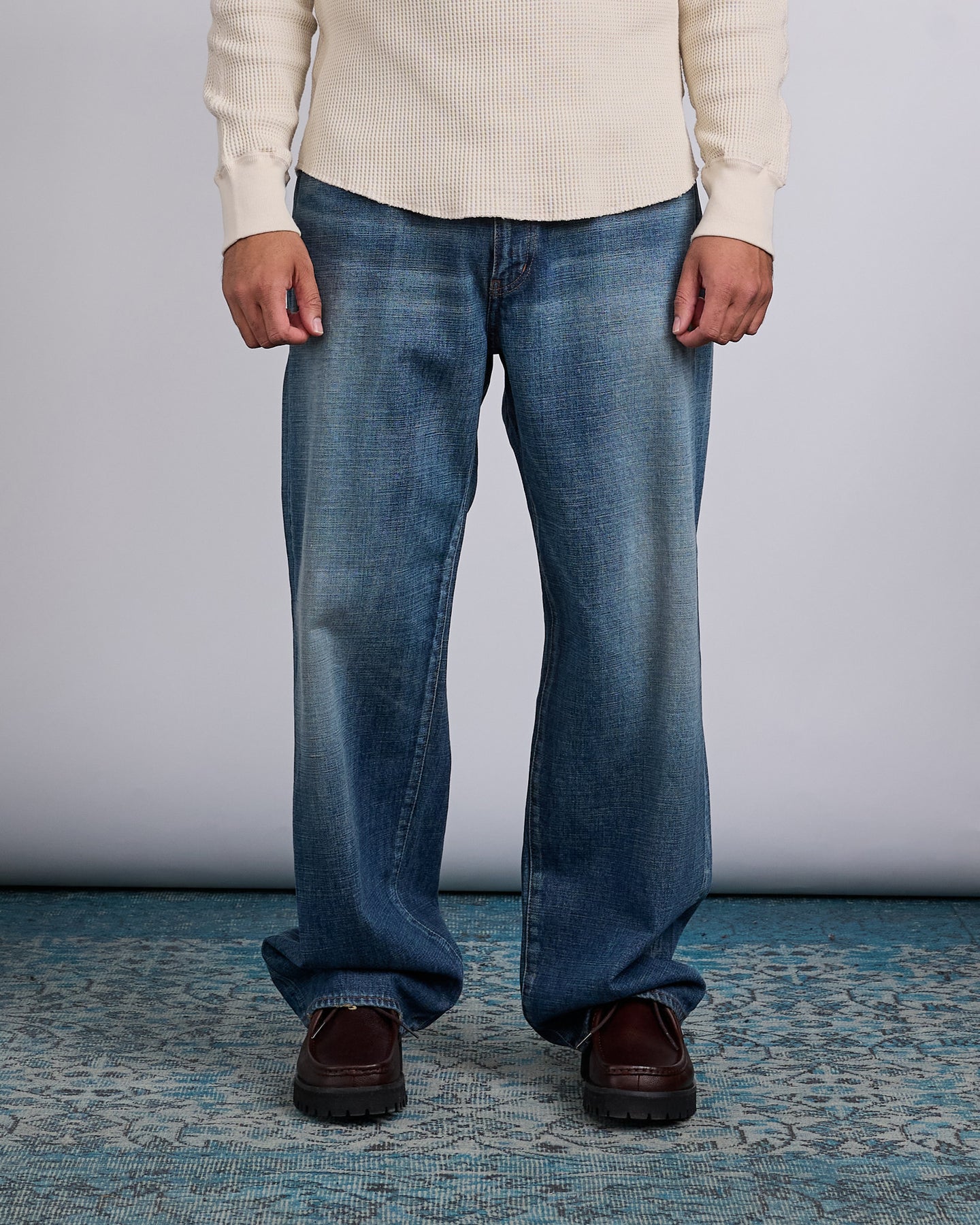 The nanamica Selvage Denim Pants offer a wide straight cut with a classic five-pocket design, blending vintage aesthetics with modern functionality. Made from original selvedge denim, the fabric is crafted using a unique thick slub yarn, where recycled polyester is wrapped in cotton and dyed with the rope dyeing technique. Woven slowly on a traditional shuttle loom, this denim incorporates air for a soft, textured appearance that conforms to the body over time, developing the distinctive fading of selvedge denim. Finished with a one-wash treatment for a worn-in feel, the design is enhanced with a front zipper opening and an inseam gusset for improved mobility.