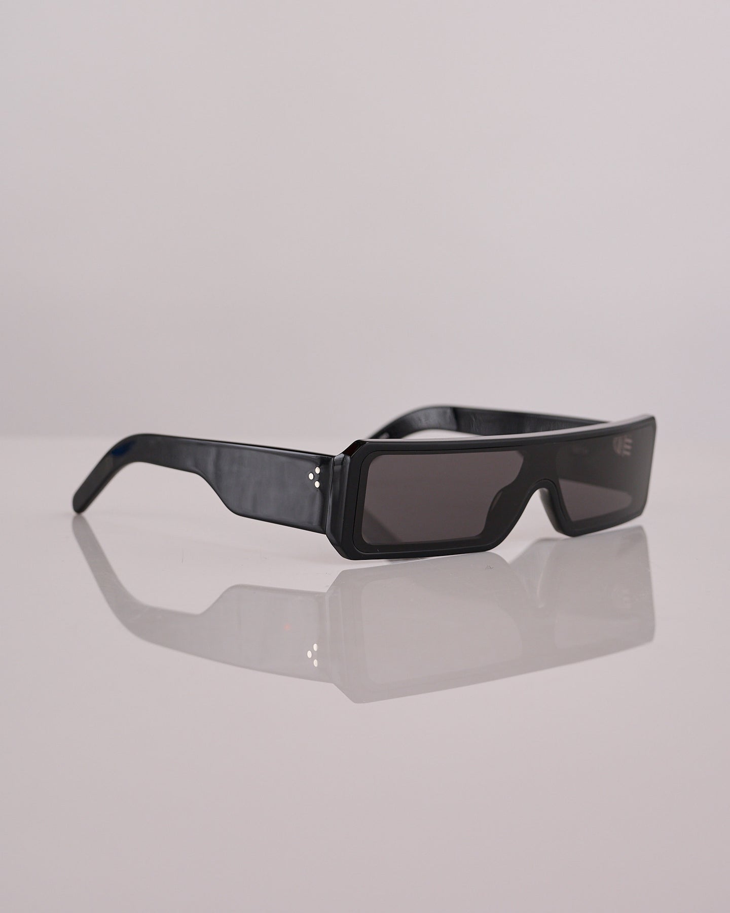 These Geth sunglasses feature a sleek and slim rectangular black acetate frame with a single cut lens. They have wide arms with the signature trio of silver rivets on each temple and Rick Owens logo on inside right.