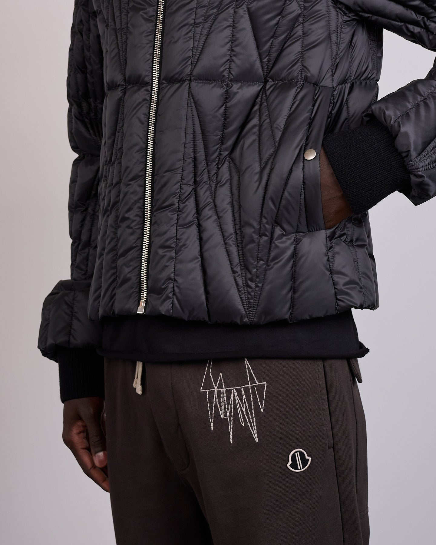 This Moncler + Rick Owens Geocamo flight jacket in recycled ultra-lightweight polyester is above hip length with long sleeves and a slim fit. It has a center front metal zipper with placket and top snap, side snap-welt pockets, and a rib knit wool blend collar and cuffs. It features the signature level shoulder seams and a cotton webbing strap with rivet detail on the back yoke. It is a duvet jacket featuring the Geocamo quilting design across the front and back body. It has the Moncler + Rick Owens embroidered logo patch on the upper left arm. It is lined with recycled ultra-lightweight polyester and has interior pockets with metal zippers. This flight jacket is lightweight down-filled.
