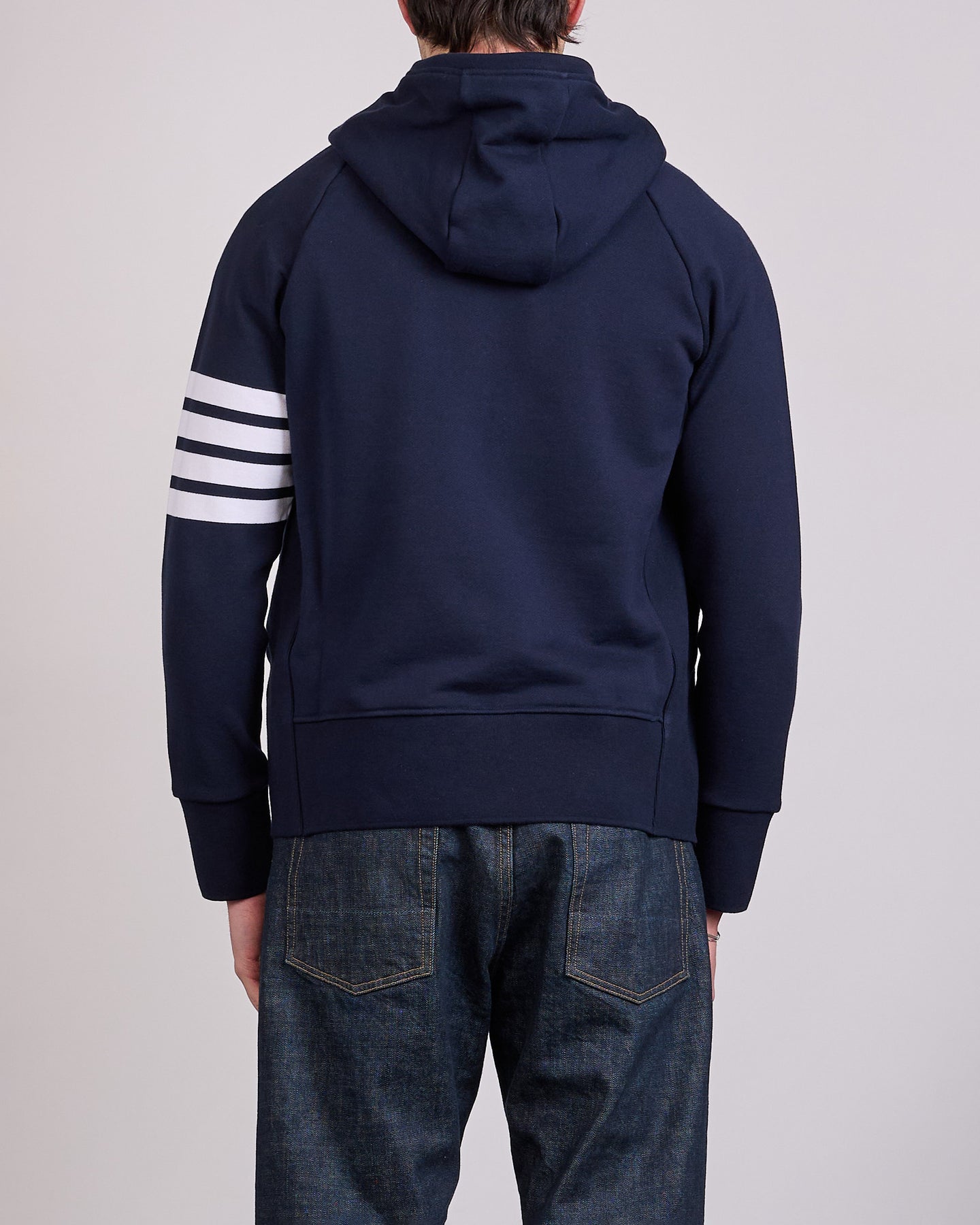 Thom Browne translates athletic wear into something elevated with the Classic Loopback 4 Bar Zip Hoodie, pairing a familiar silhouette with tailored structure and unmistakable branding. The loopback cotton gives the piece a clean drape without sacrificing comfort, while the 4 Bar sleeve stripes and grosgrain accents reinforce the designer’s uniform language. Wear it on its own or with the matching sweatpant for a complete head to toe look.
