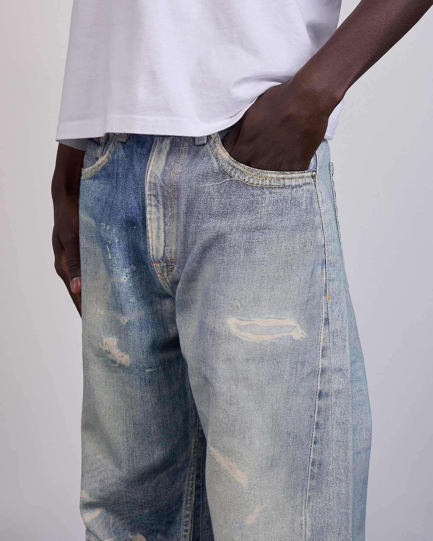 A wide-leg denim with a twist. The Third Cut from Our Legacy is crafted from Italian cotton denim and digitally printed with a trompe l'oeil vintage wash — mimicking the look of a perfectly worn-in pair without the years of break-in. Finished with classic five-pocket detailing, metal rivets, and reinforced back pockets.