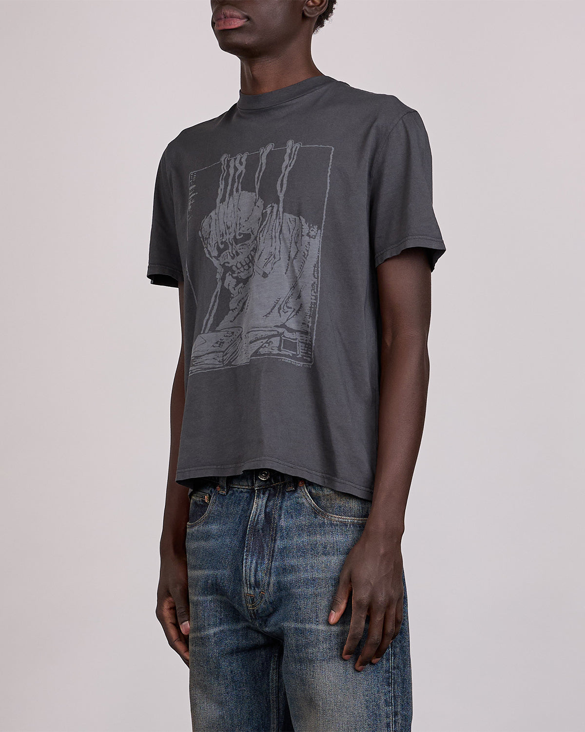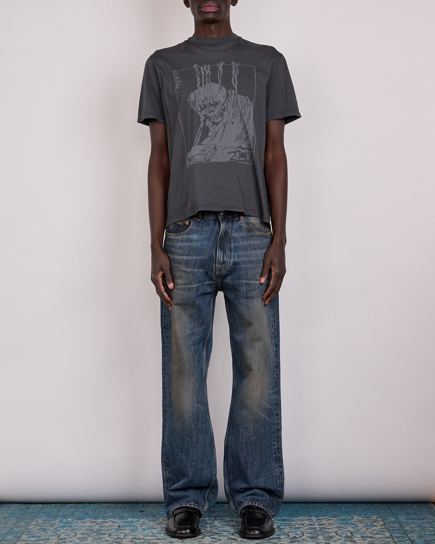 Each garment is created through a unique treatment process that results in individual variation in shade and surface. The laser printing creates intentional small holes within the print that will continue to evolve through wear, while the pigment dyeing will naturally distress over time.