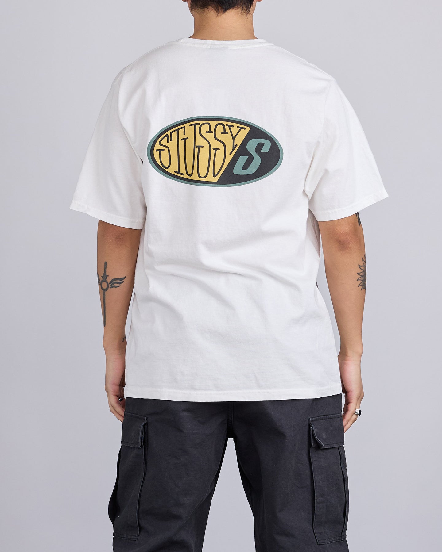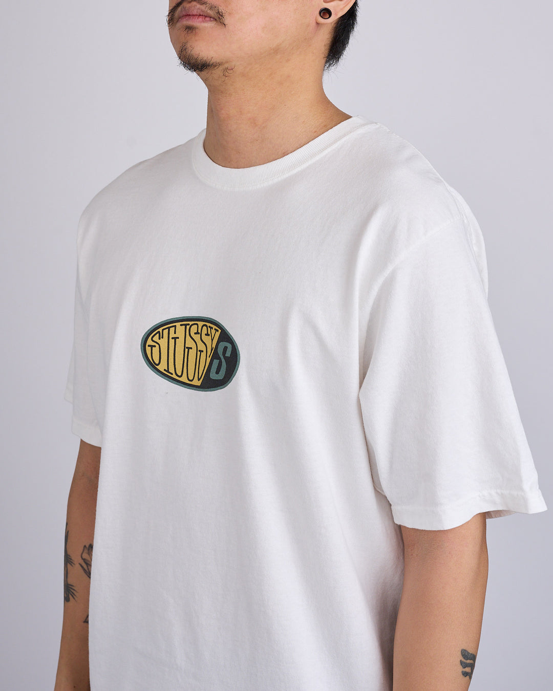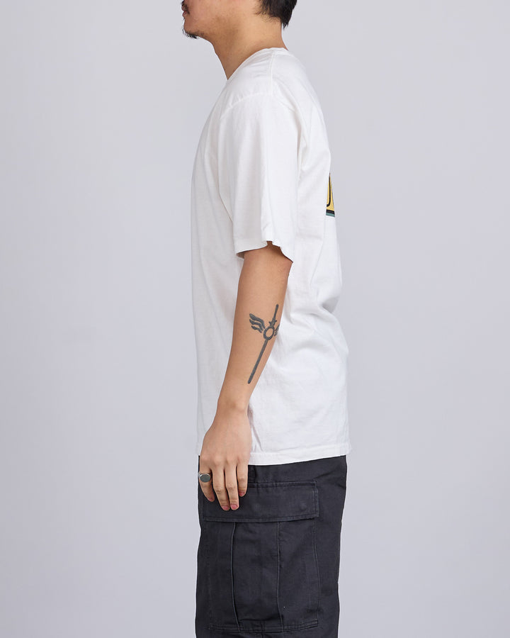 Relaxed fit pigment dyed tee in midweight 220gsm cotton jersey. Front and back graphics screenprinted using water-based ink for a soft hand feel.