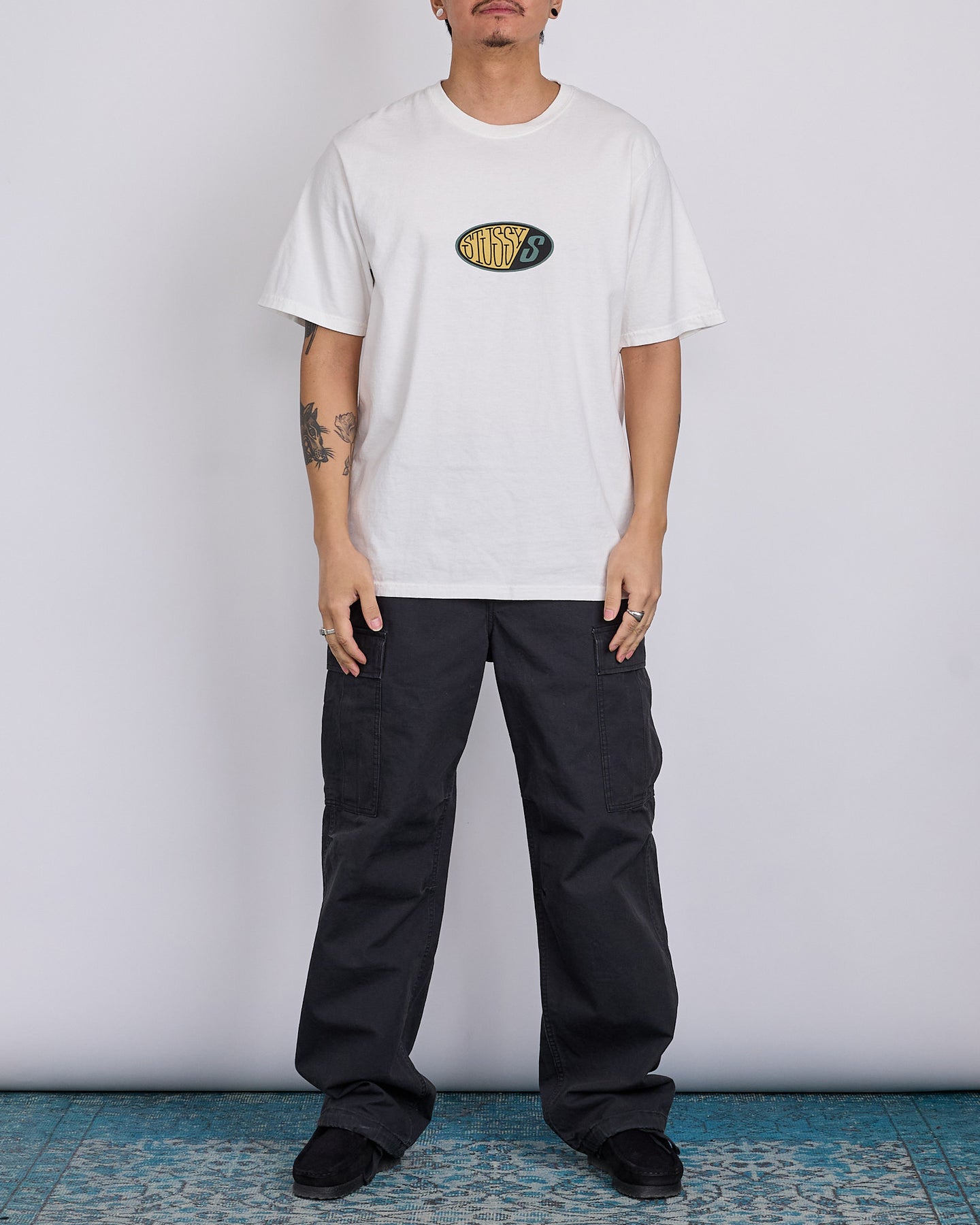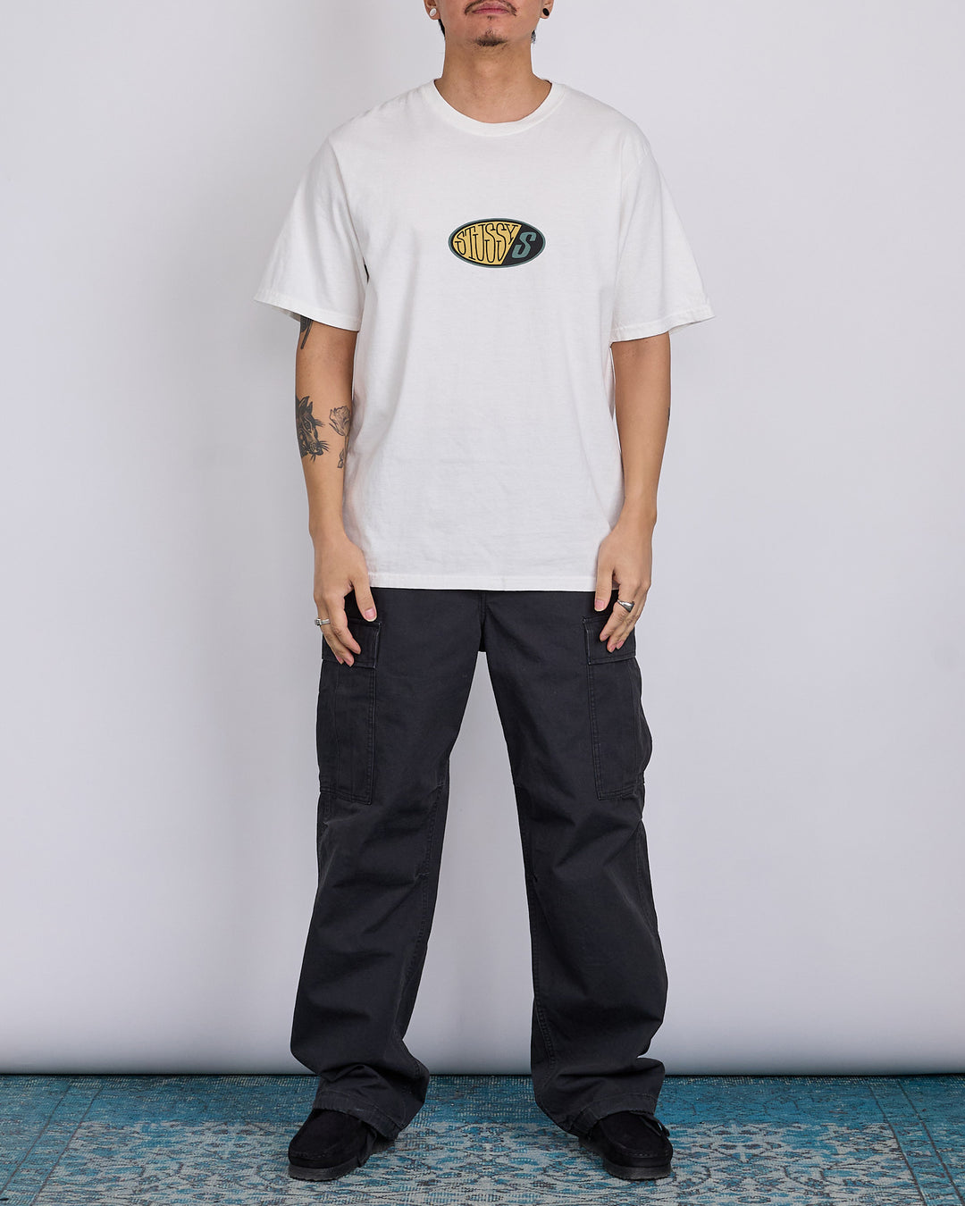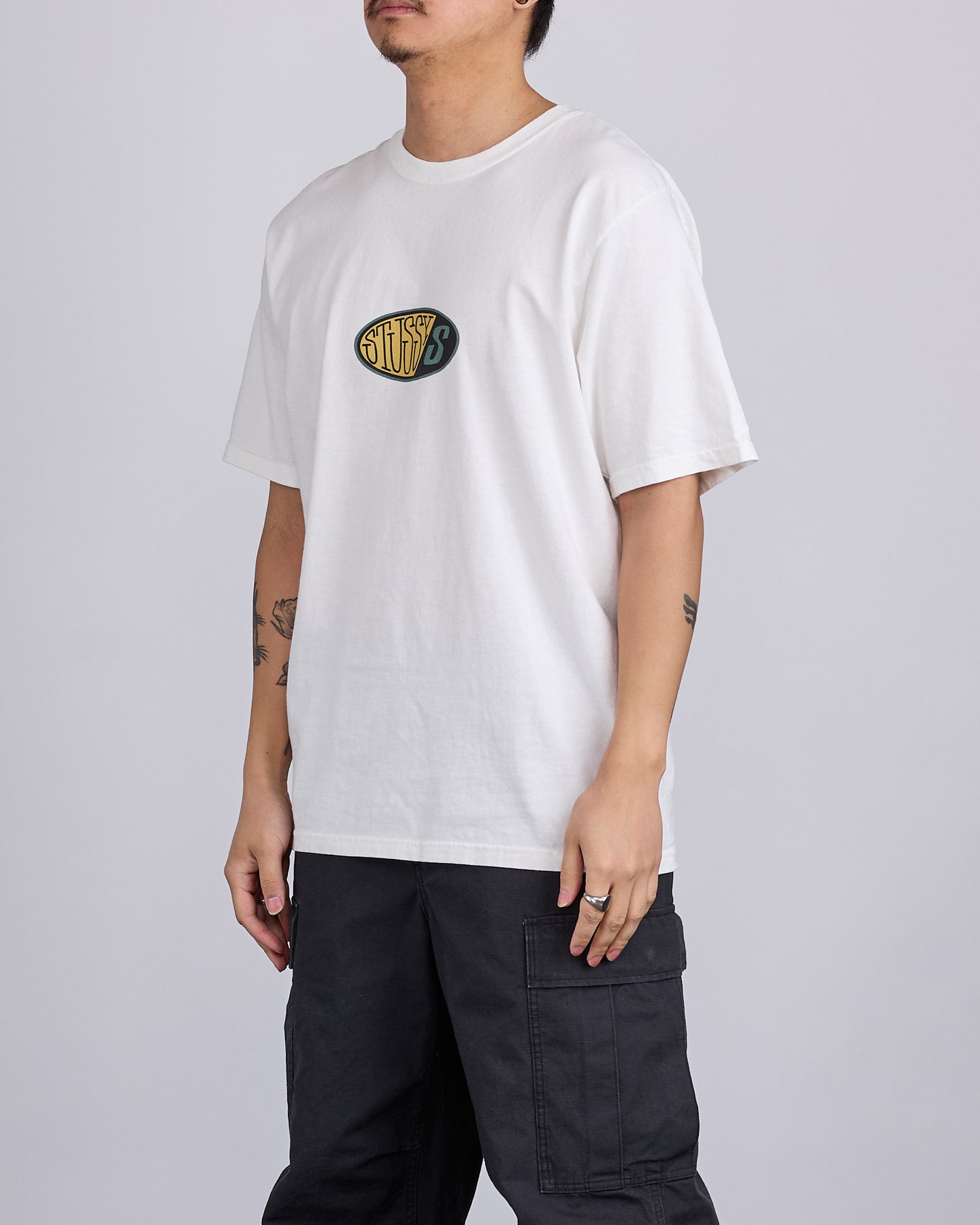 Relaxed fit pigment dyed tee in midweight 220gsm cotton jersey. Front and back graphics screenprinted using water-based ink for a soft hand feel.