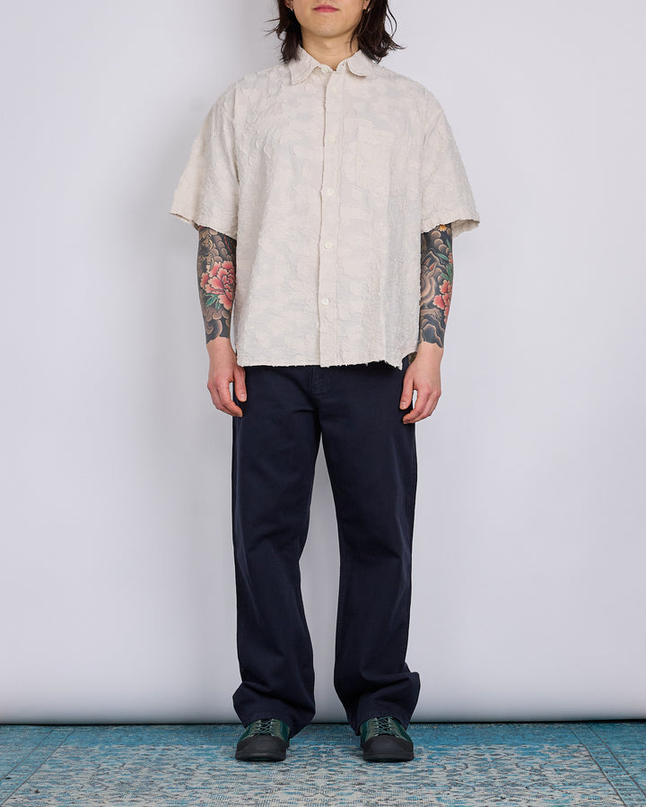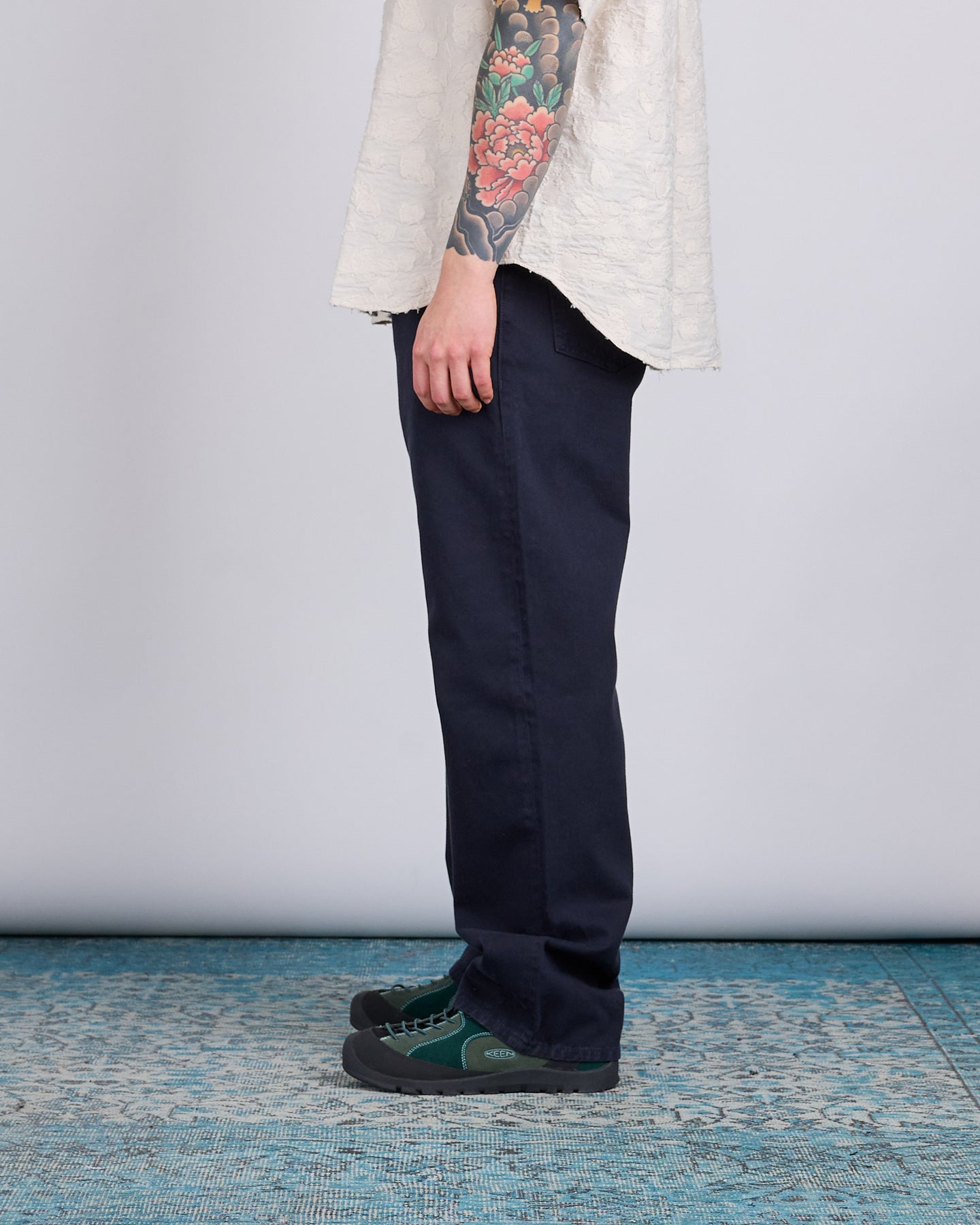 A relaxed five-pocket pant made in a garment dyed heavy 3x1 twill. Cut with a longer rise and a wider leg that tapers slightly from knee to hem, this style has a slightly looser fit. Finished with heavy stitching, zip fly and branded metal hardware and tab at the back.