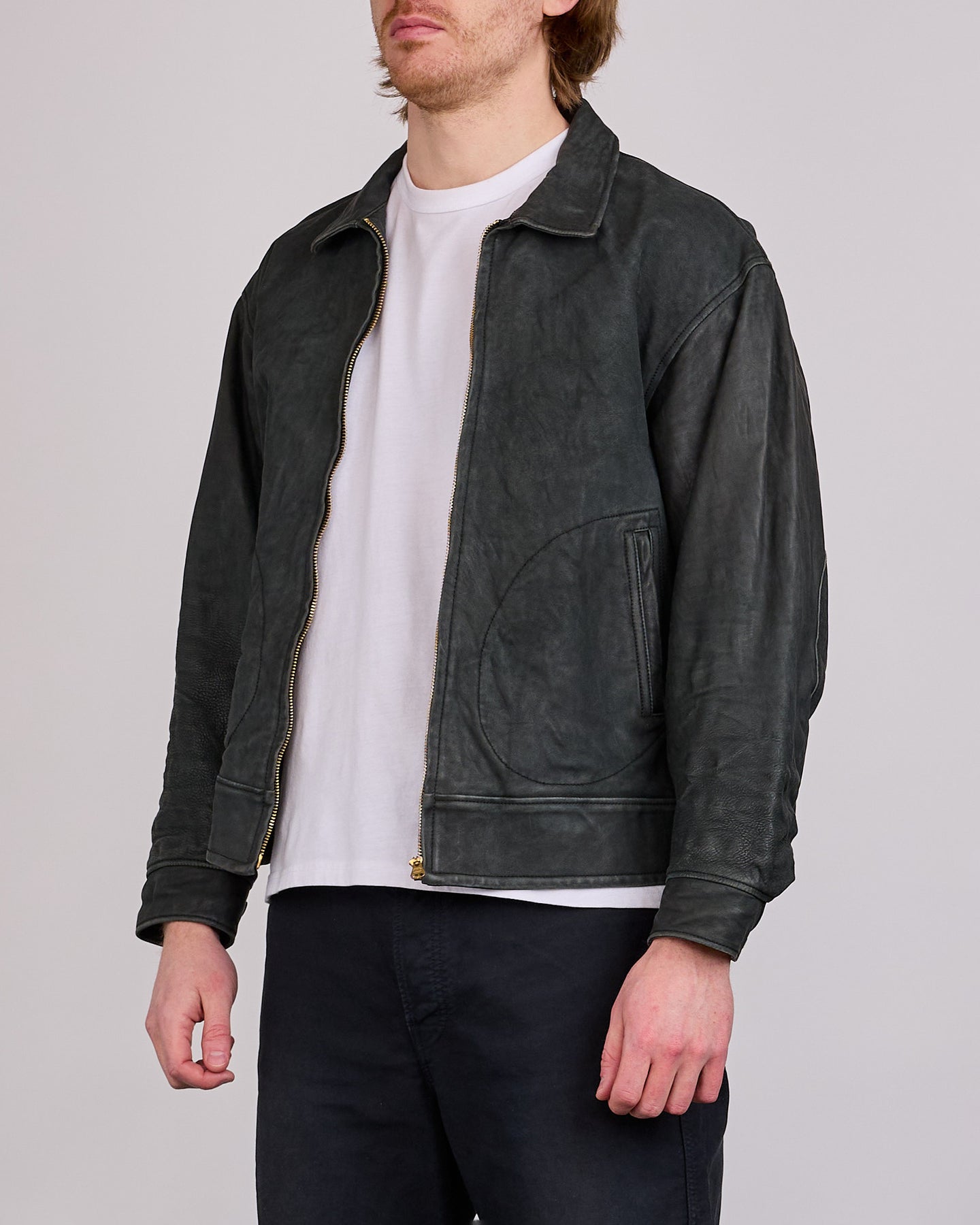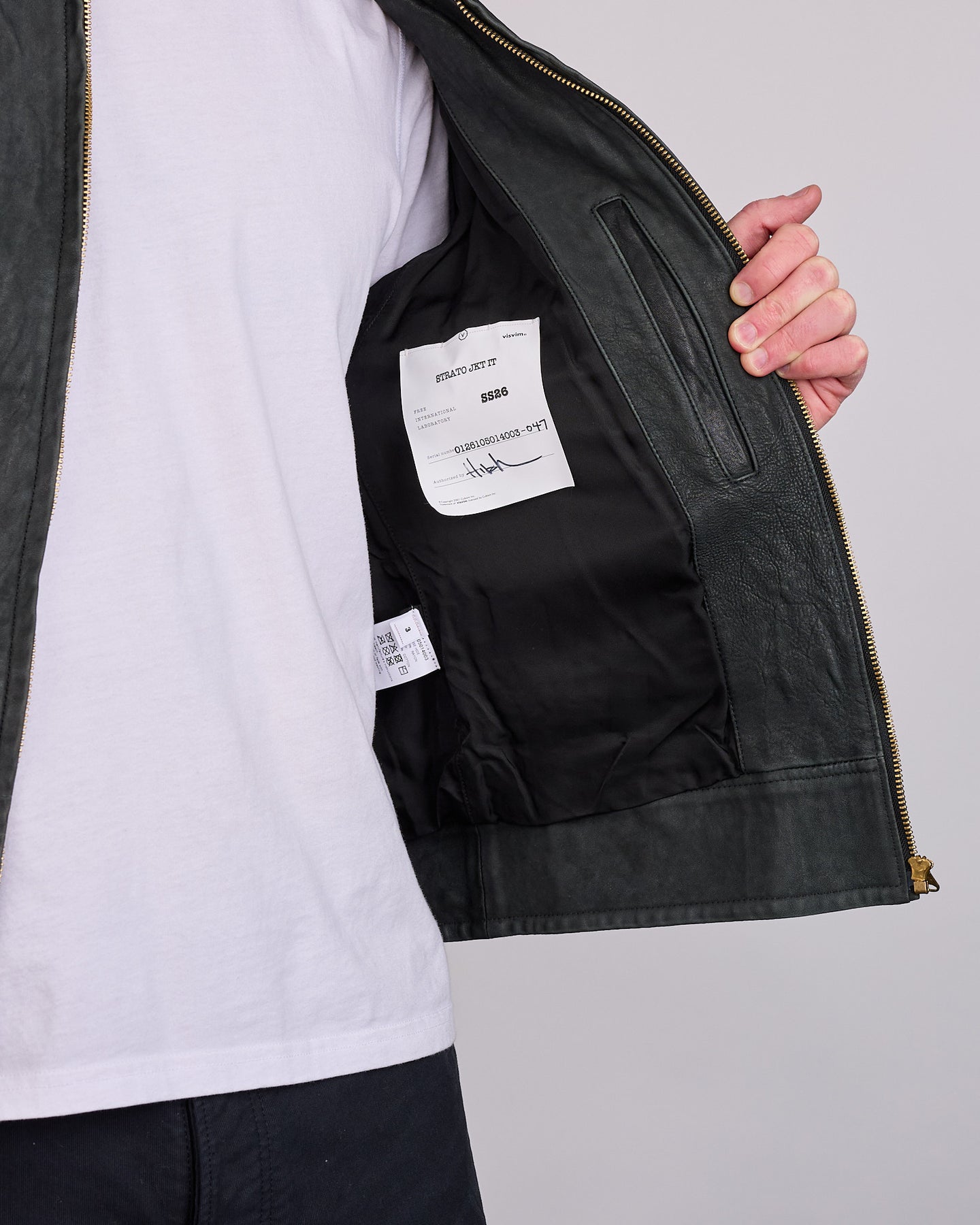 Produced in Italian vegetable-tanned horsehide leather, the visvim Strato Jacket IT Black showcases refined leather craftsmanship with a relaxed, modern silhouette. Specially treated to bring depth and character to the surface, the jacket balances structure and ease through dropped shoulders and a softly shaped body.